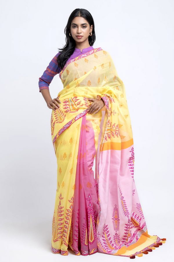 urban chic ensemblePastel Yellow Half Silk Printed Saree
